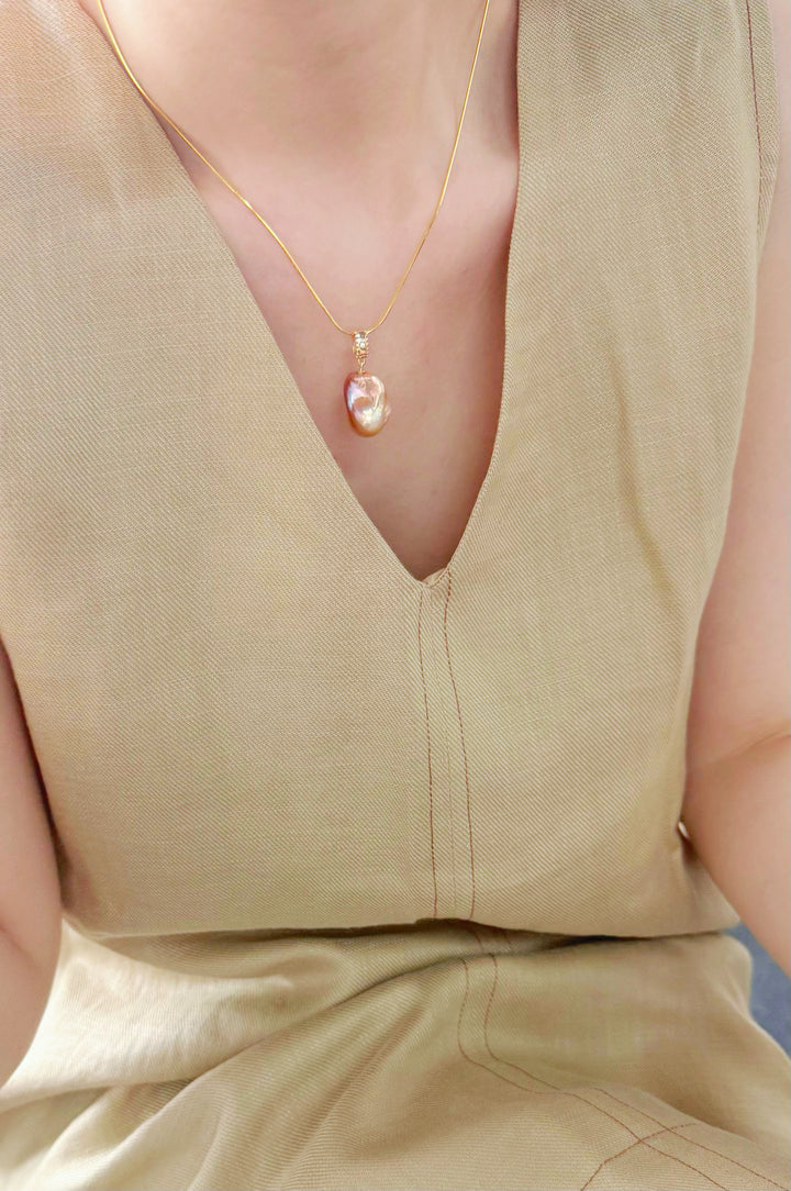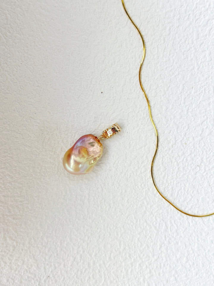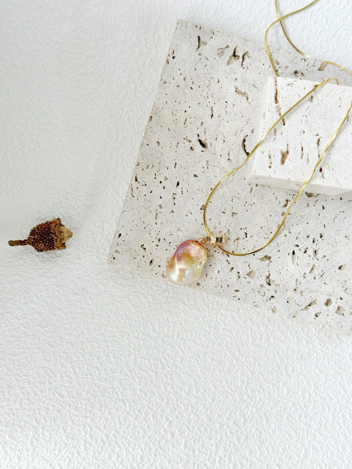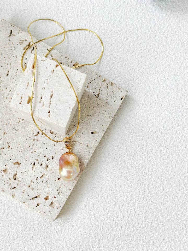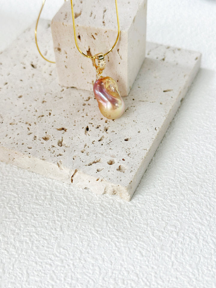 The baroque pearl pendant is the star of this necklace, boasting an irregular shape that's characteristic of baroque pearls. Its surface shimmers with a beautiful iridescence, displaying a spectrum of colors from soft pinks and peaches to subtle purples and blues, creating a mesmerizing visual effect. The pearl is elegantly attached to the 18K silver - plated chain with a 精致的镶嵌设计,possibly featuring small cubic zirconia or other sparkling accents, enhancing its luxurious appeal.